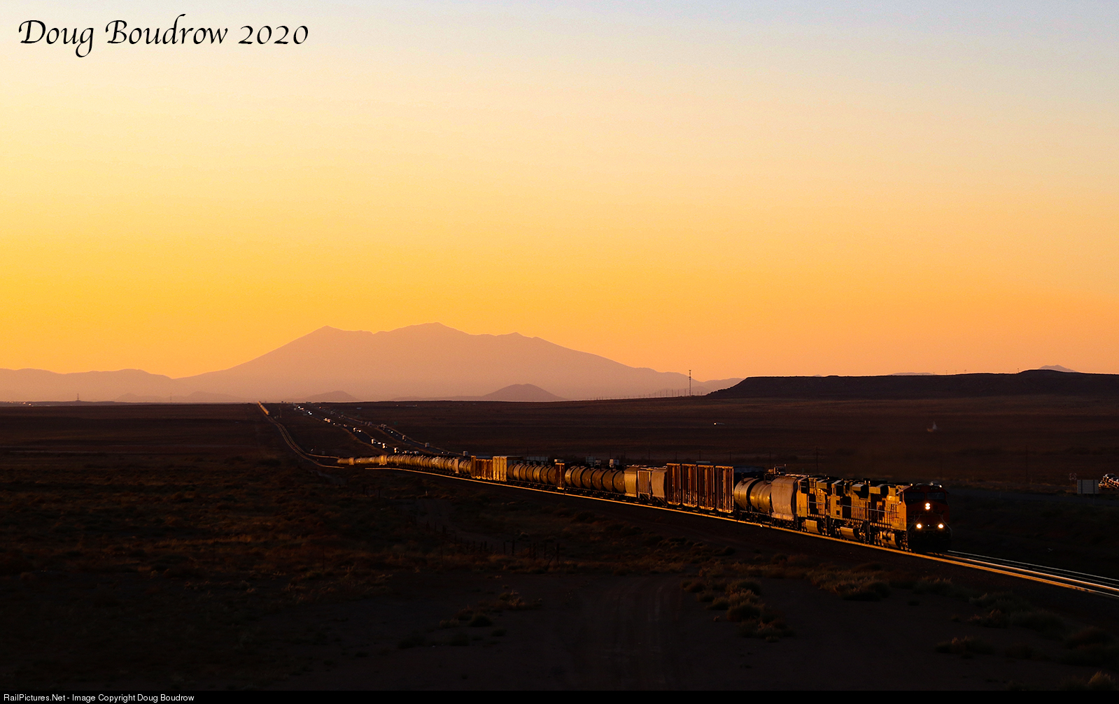 | As the Arizona sun fades over the horizon and creates a beautiful glow, an Eastbound manifest is seen coming into Winslow off the high desert. The 12,633 peak of the San Francisco Mountain can be seen in the distance through the haze created by wildfire smoke. |