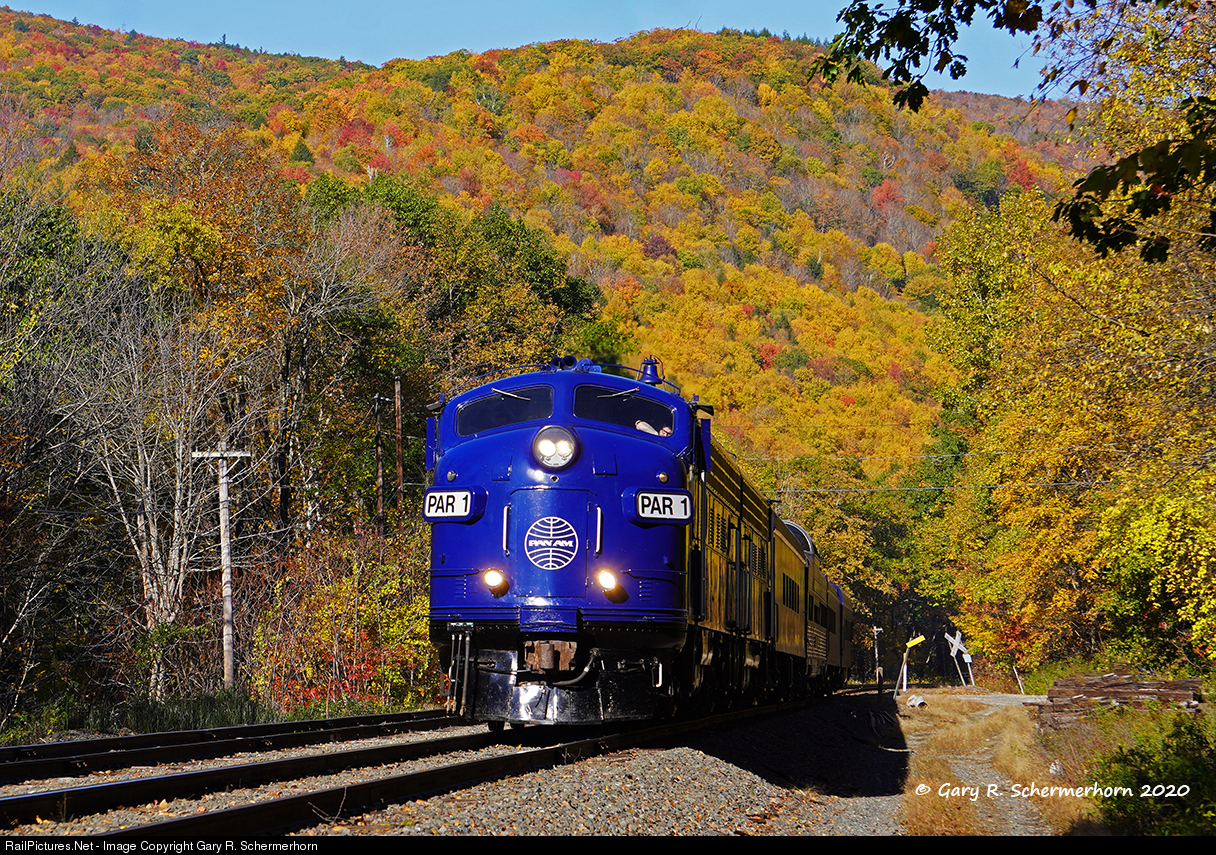 | On a stunning day in the Hoosac Range, the foliage is on fire at its peak as the Pan Am “Clipper” OCS rumbles past the “soapstone” siding just east of the Hoosac Tunnel on its latest tour of the scenic west end with potential buyers on board. |