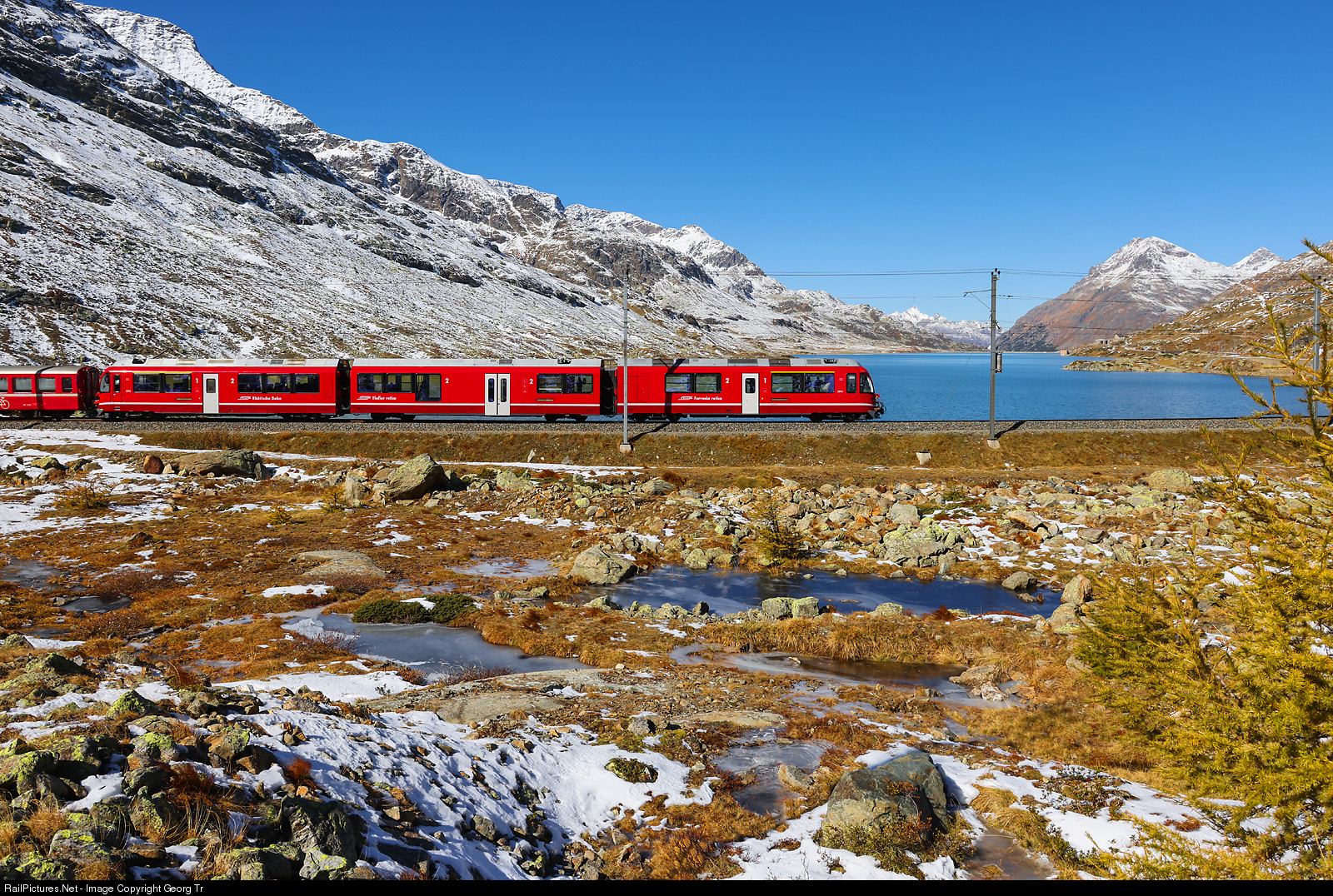 | "Allegra" railcar ABe 8/12 # 3514 of the Rhaetian Railway with regional train 1644 from Tirnao to St.Moritz, running along the Lago Bianco (white lake) on about 2250 meter a.s.l. on the Bernina pass line. |