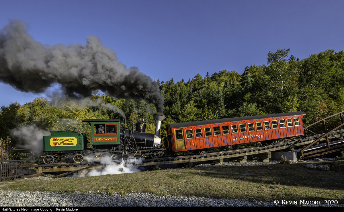 For almost the first decade of the diesel era at the Mt. Washington Cog Railway, the use of steam power was limited to just one trip per day, usually the very first departure. With that single trip proving to be popular and often selling out well in advance, the line elected to add a second steam run a couple of years back, typically as a second section of the last trip of the day. The basic problem with running steam in a diesel environment is that the steam locomotive is somewhat slower than the modern power, and would just be in the way if introduced in the middle of the normal schedule. Therefore, the scheduled steam trips typically leave about 30 minutes before the first diesel trip of the day, and just after the last trip. The timing of these first and last trips varies somewhat, depending on the time of the season. During most of the season, the first trip will be at 8:30 AM and would look like the capture seen here. During the fall foliage season however, the first trip is typically sent up the hill a full hour earlier, even before the sun first pokes its head above the mountain. The last trip of the day will generally leave at 4 PM and will not return to the base station until about 30 minutes after sunset. During fall foliage season the railroad is quite a busy place. That last trip of the day can often consist of as many as 4 sections: three diesel and one steam.