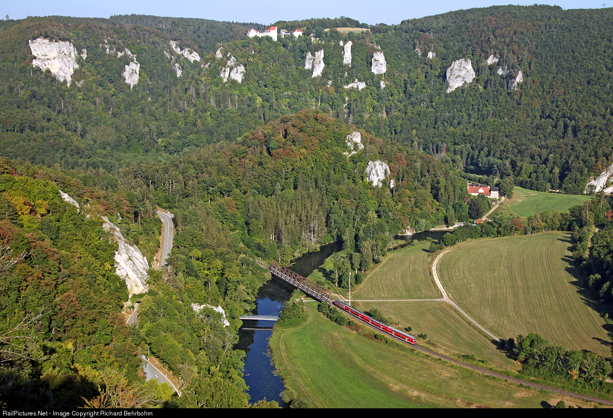 | Push pull train with locomotive type 218 and three double deck cars is en route from Ulm to Donaueschingen in the valley of the young river Danube. |