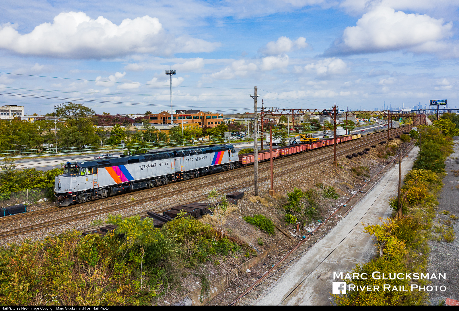 An Aptly Named Train. NJ Transit "Extra 4119" featured both F40PH-2CATs on the roster, 4119 and 4120. The "twins" as they have become known, were back to back on a tie train on the afternoon of Monday, October 19, 2020, as they attended to the MOW needs of the Morris & Essex Line in Harrison, NJ.
