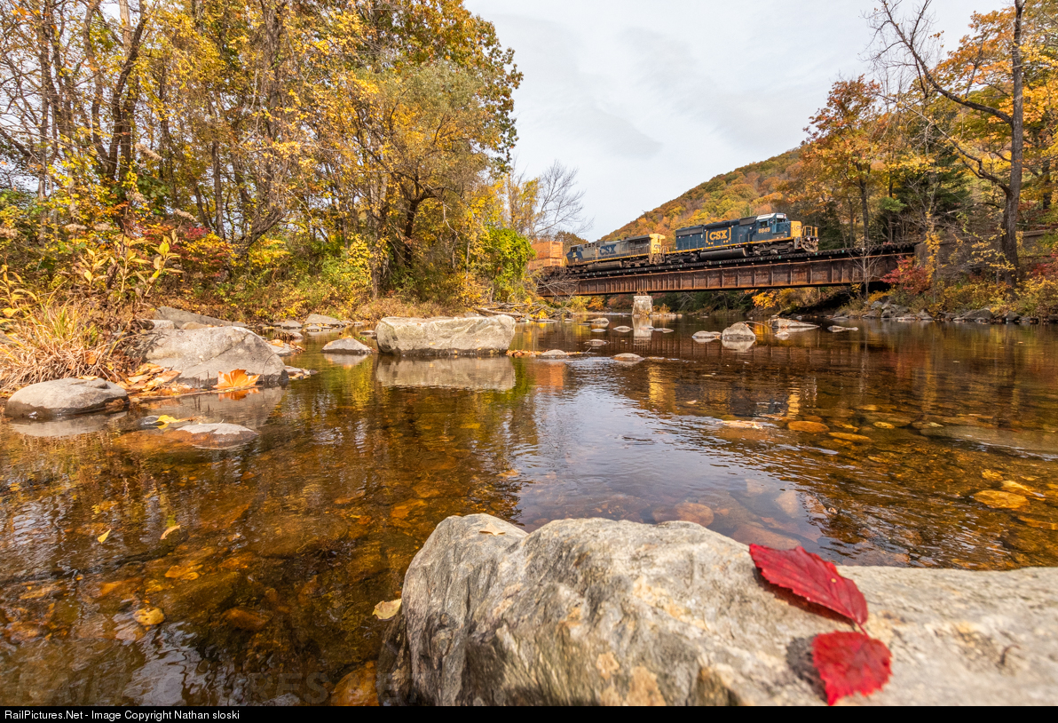 | Fall Colors and EMDs: The leaves show off their color as Q008 flies over the Westfield River as it heads east over the Berkshire Subdivision. 008 has a rare pair on this run, CSXT 8849 , an SD40-2, and CSXT 20. Seeing a train on the B&A without any GEVOs in the consist has become increasingly rare compared to a few years ago. |