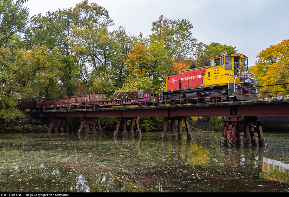 | Getting ready to make history. The final Morristown & Erie scrap train sits on Half-Moon Bridge as a crew finishes loading the last car. After one last run down Monroe St. the Dundee Spur will never see another train. The event was commemorated by the M&E with a banner on the front of the locomotive with logos of every railroad to use the spur, as well as the years of operation, 1880-2020. |
