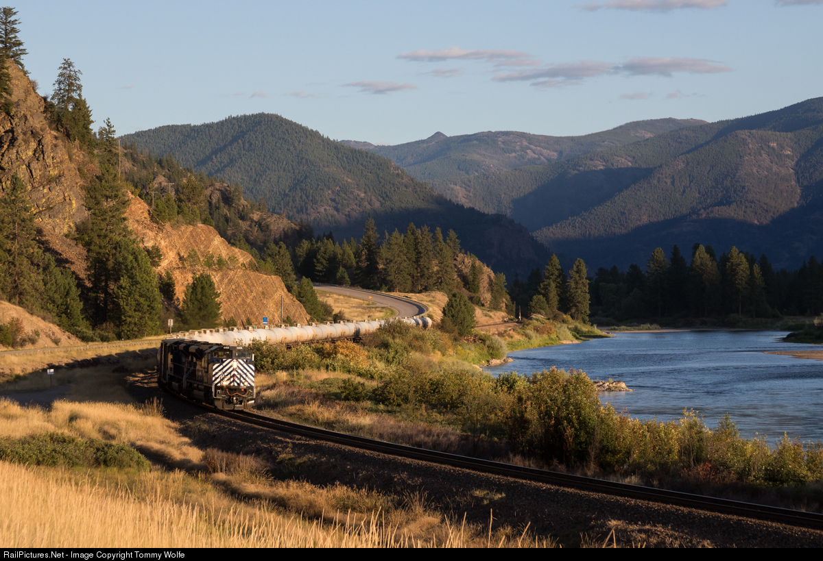 | Montana Rail Link's night gas local from Missoula to Thompson Falls Montana skits the Clear Fork River between Paradise and Plains Montana. The western Montana mountains add a stunning back drop to this already stunning place. |
