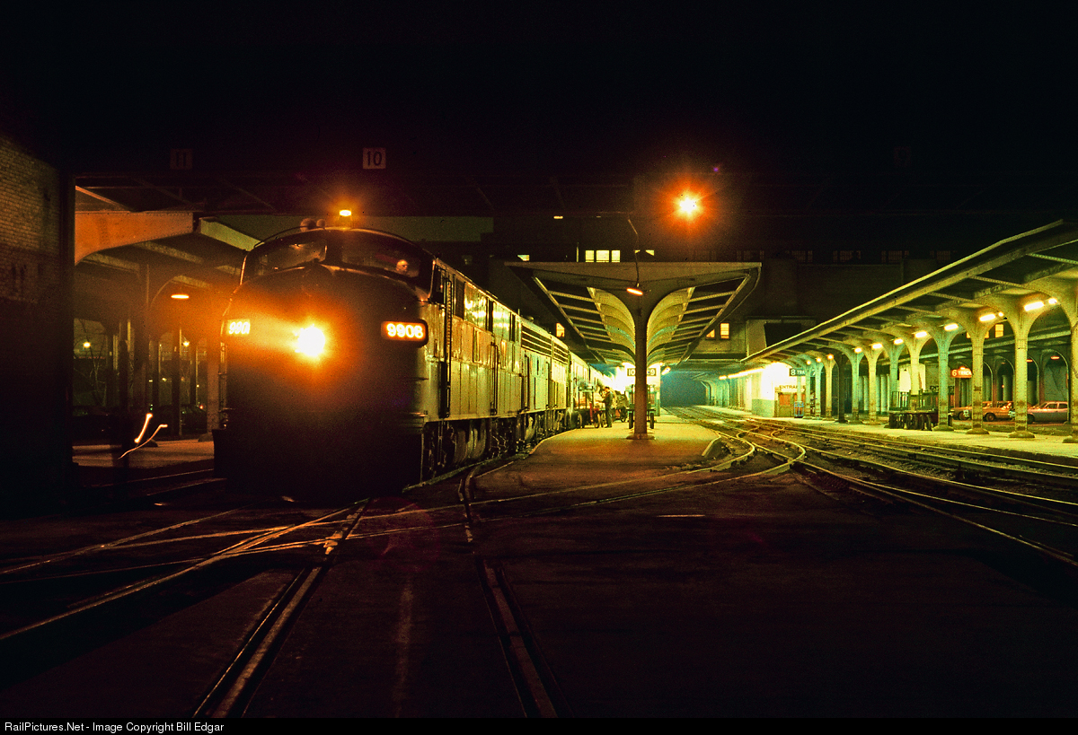 Ending its career where it started, BN 9908, former GN 510, graces the point of the Empire Builder as it loads baggage and passengers prior to its evening departure from Minneapolis for Spokane, Seattle and Portland. Bought for Empire Builder service in the 1940s, GN pulled the E units off the premier trains replacing them with F units and eventually SDP40s and SDP45s. By April 1971, days before the start up of Amtrak, BN had pulled the newer power over to freight service and the old Es and Fs once again started handling the Builder. I would think this power set would have been exchanged at Havre, MT for a set of all F units for the western portion of their journey over the Rockies and Cascades.