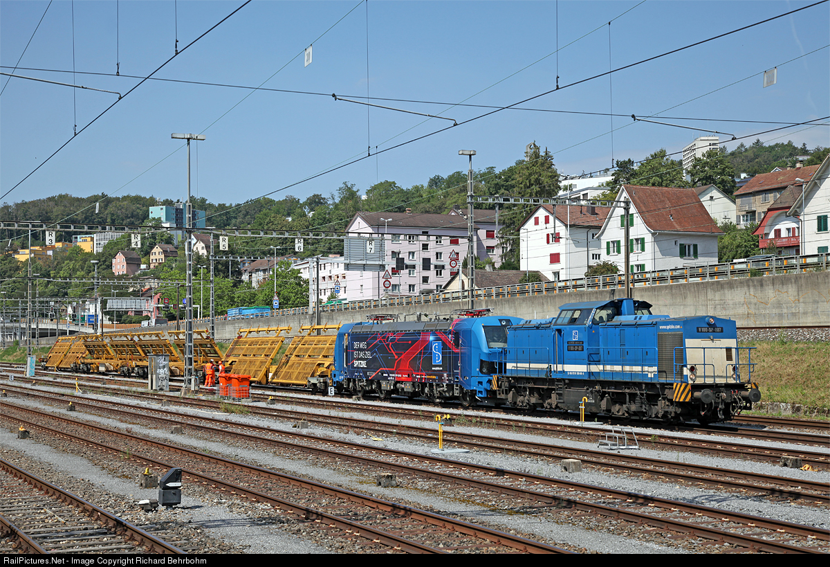 | Spitzke is an euopean railway infrastructure company. Spitzke Logistik V 100 SP 007 (a former locomotive of Deutsche Reichsbahn in the German Democratic Republic) and Siemens Smartron 192 007 are pulling empty cars for transport of switches from Schaffhausen to Karlsruhe. |
