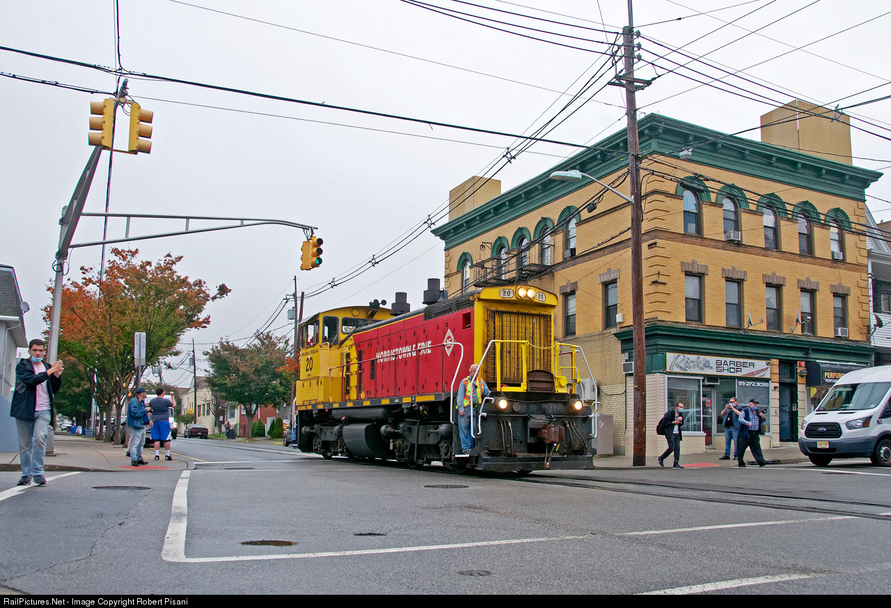 | M&E 20 operates light down Monroe Street in Garfield for the last time. This "final run" consisted of the crew pulling the final three loads of salvage material out of Passaic, thus ending 140 years of operation on the former Erie Railroad Dundee Spur. Due to the moves operating at walking speed with a police escort (out of view), photographers were able to pursue the train on foot to get as many photo and video angles as humanly possible. |
