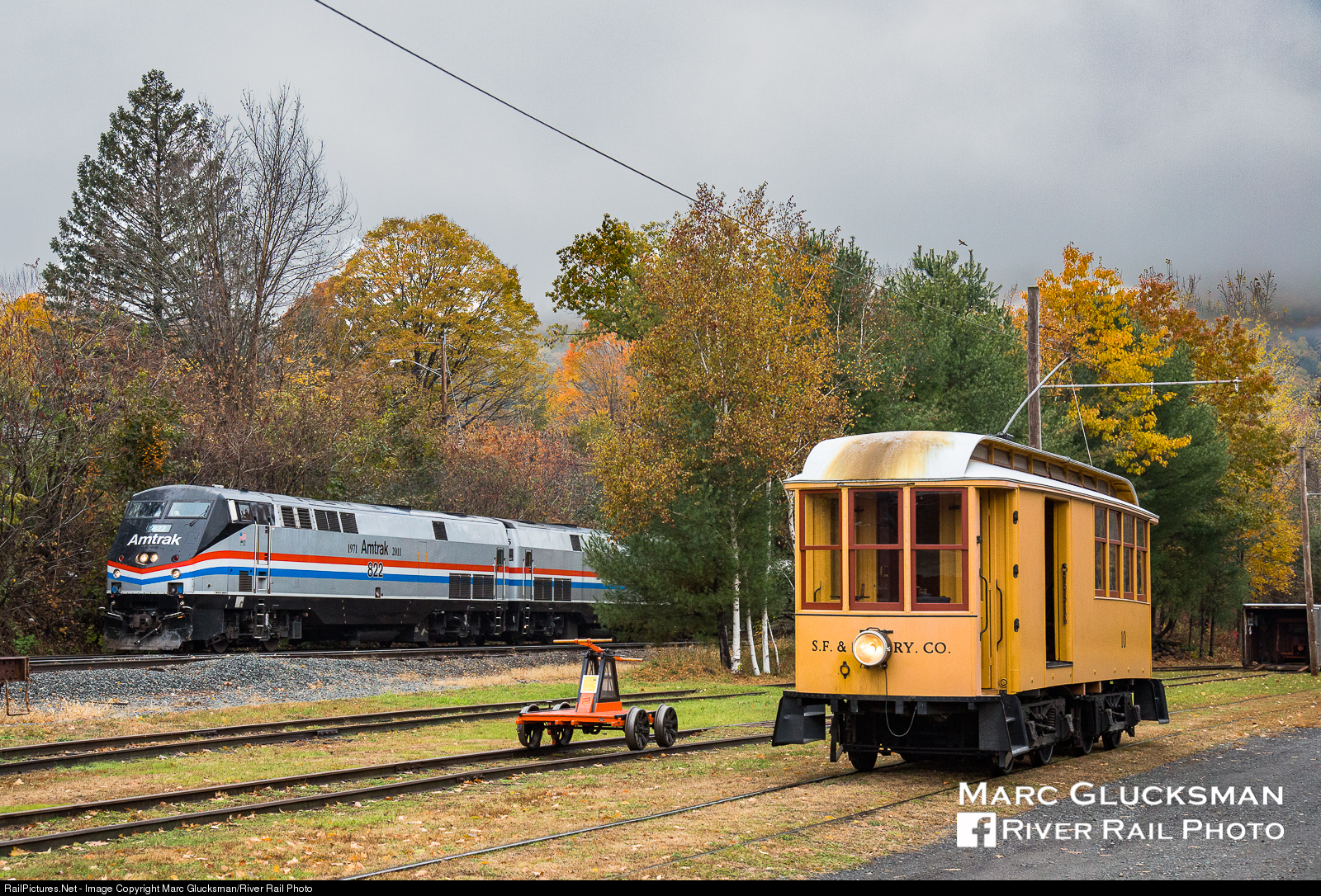 On The Most Unexpected Of Meets. The 2015 Amtrak Autumn Express was a novelty. Originating out of the Albany-Rensselaer, New York Station, it operated round trip to East Deerfield, Massachusetts for two days. A bit of last minute negotiation with the volunteers of the Shelburne Falls Trolley Museum in Shelburne Falls, Massachusetts on Saturday, October 25, 2015 lead to the both the stars and their 1896 combine trolley (Shelburne Falls & Colrain Street Railway #10, Wason Manufacturing Co.) being aligned for the passing of Amtrak P40DC 822 (Phase III). This section of the former Boston & Maine Railroad (today's Pan Am Railway) has not seen regular passenger service since 1958.