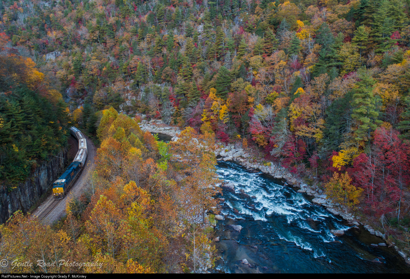 Q693 exits the Nolichucky Gorge at Poplar, NC along the former Clinchfield mainline on a beautiful Fall morning.