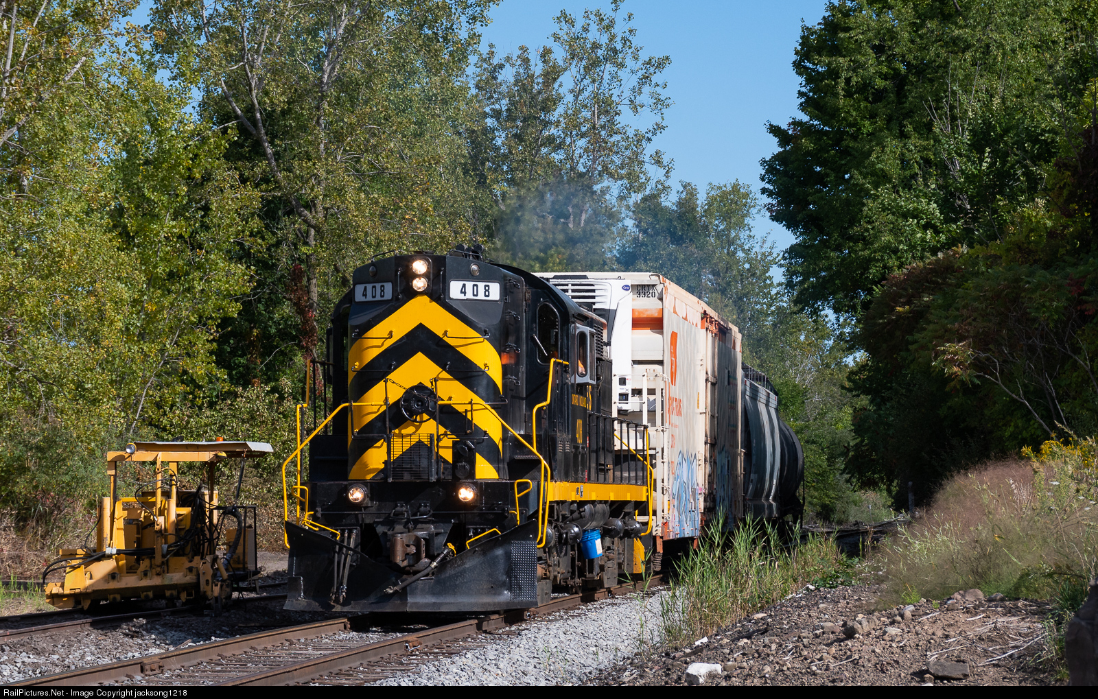 | After picking up a Cyro-Trains reefer from North Rose, OMID ALCo RS-36 number 408 leads the short train southbound past track equipment near the Quarry Road crossing in Sodus Center, NY. |