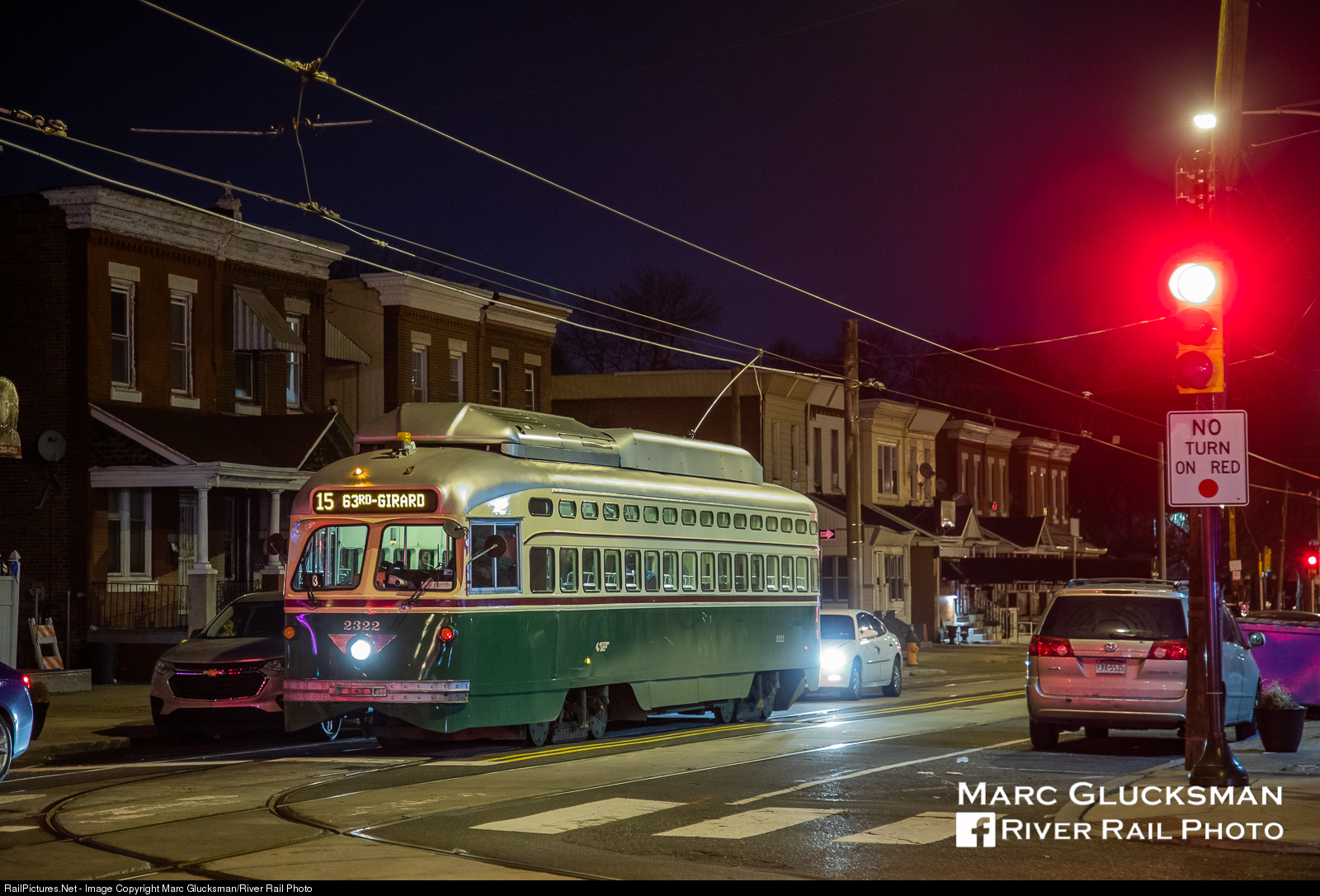 | PCC-IIs 2322 is on Route 15 crossing Haverford Avenue on Girard Avenue on the evening of Friday, January 24, 2020. SEPTA has announced that this is the last day for trolleys and it will operate buses on the Route 15 until further notice. |