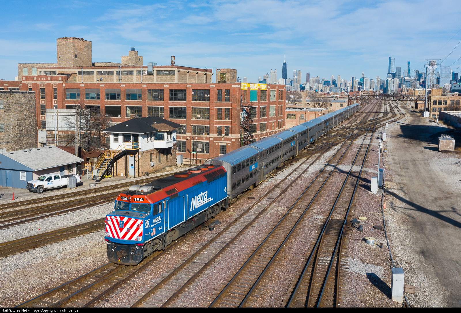 | Metra F40 154 shoves it's train towards downtown Chicago for its first run of the afternoon, passing through the Tower A2 control point after leaving the coach yard. |