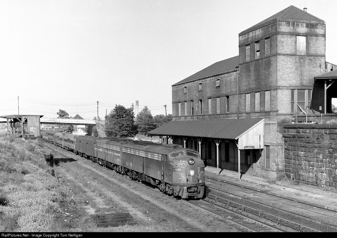 A pair of ex-PRR E8s still in Pennsy colors lead a Penn Central Boston-New York train through Readville, MA, on a summer afternoon. The massive two-level ex-NH station here was destroyed by fire a few years later.
