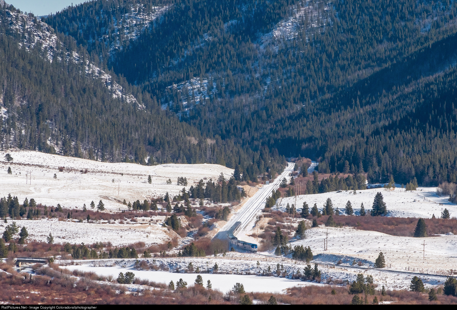 Amtrak 5 is swiftly rolling through the snowy landscape near east of Tolland, CO exiting the “gun barrel” as the crews call it in the valley of the Tolland brothers. Taken among the “Giants Ladder” on the original grade of the Moffat Road. |