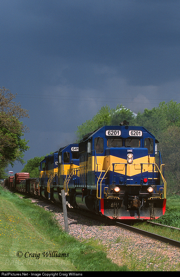 | Back in 2006 storm clouds roll off to the east as this westbound Mason City bound freight train passes just west of New Hampton. The train is around 45 miles from it's destination at Mason. The 6201 was once a BCOL 745, then went to Oneida & Western as the 9952, before coming the DME. Now days the units does duties as the MQT 3413.