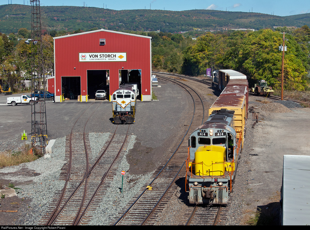 | Delaware Lackawanna BR-1 passes the new DL Von Storch Shops where a lone former PRR C425 sits in the open. The crew has just finished working in Green Ridge yard and appears to be heading for Valley Distributing in South Scranton with five box cars bracketed by a set of C420s. |