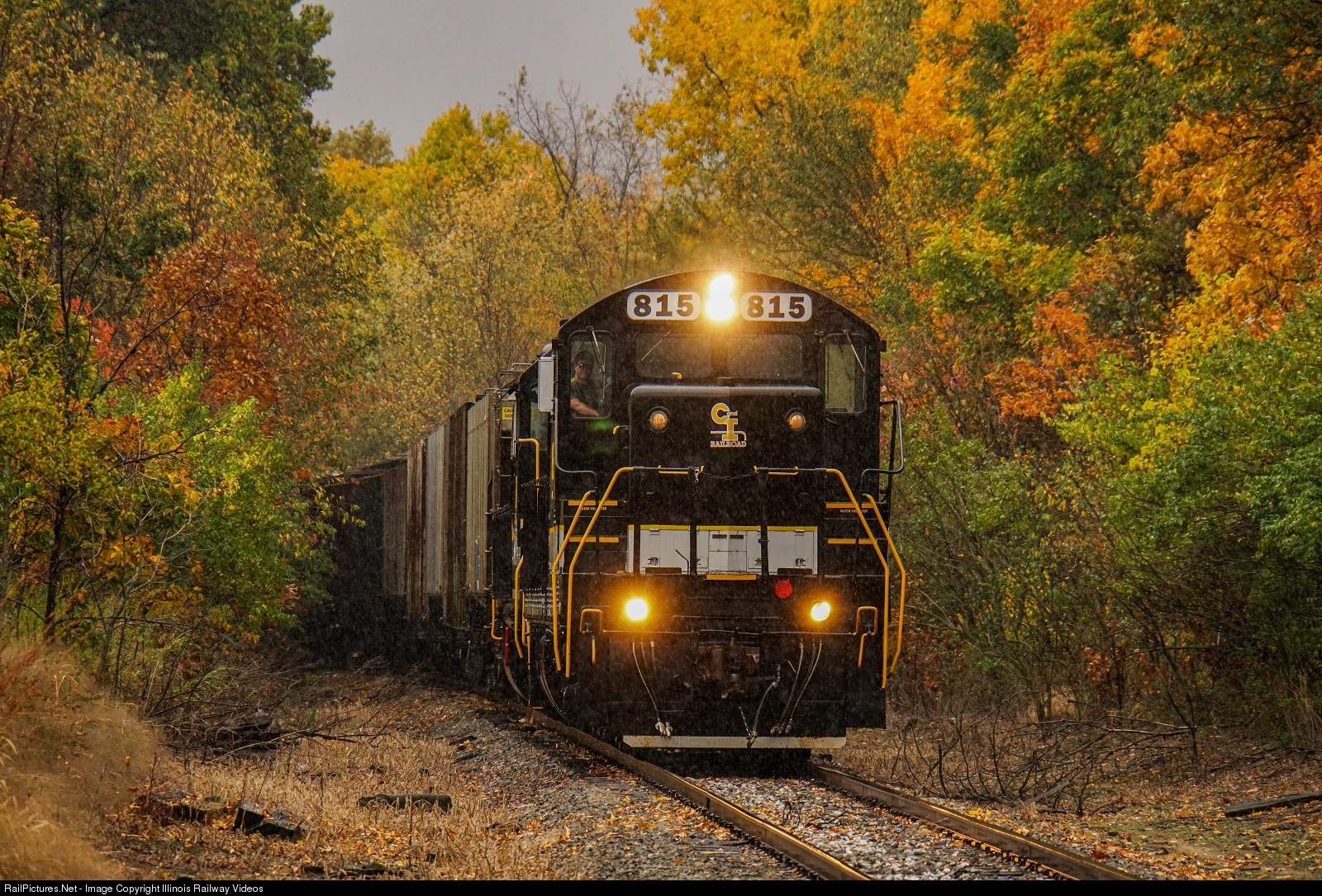 The fall colors are on full display as IBCX 815 and 5115 take an empty grain train south while a thunderstorm rolls over.