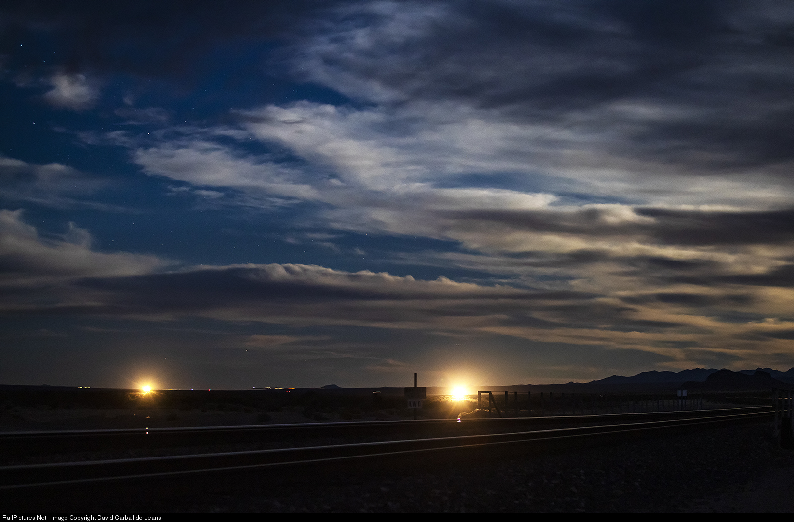 A pair of westbound trains make their way down the western slope of Goffs Hill as the first one approaches Cadiz and the second one clears the control point of Danby under a full moon sky.