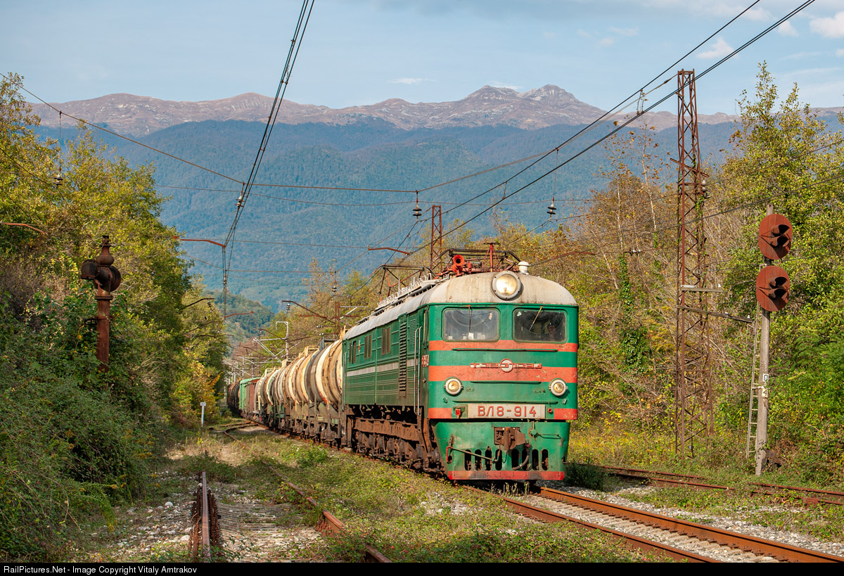 | The old soviet electric locomotiv VL8-914 is leading a freight train from Tsandripsh (border station with Russia) to Sukhum. To the left of the locomotive there is a water crane, which used to refuel steam locomotives with water. And to the right there is an out-of-order traffic light. Traffic on the railway is controlled by cell phones. |