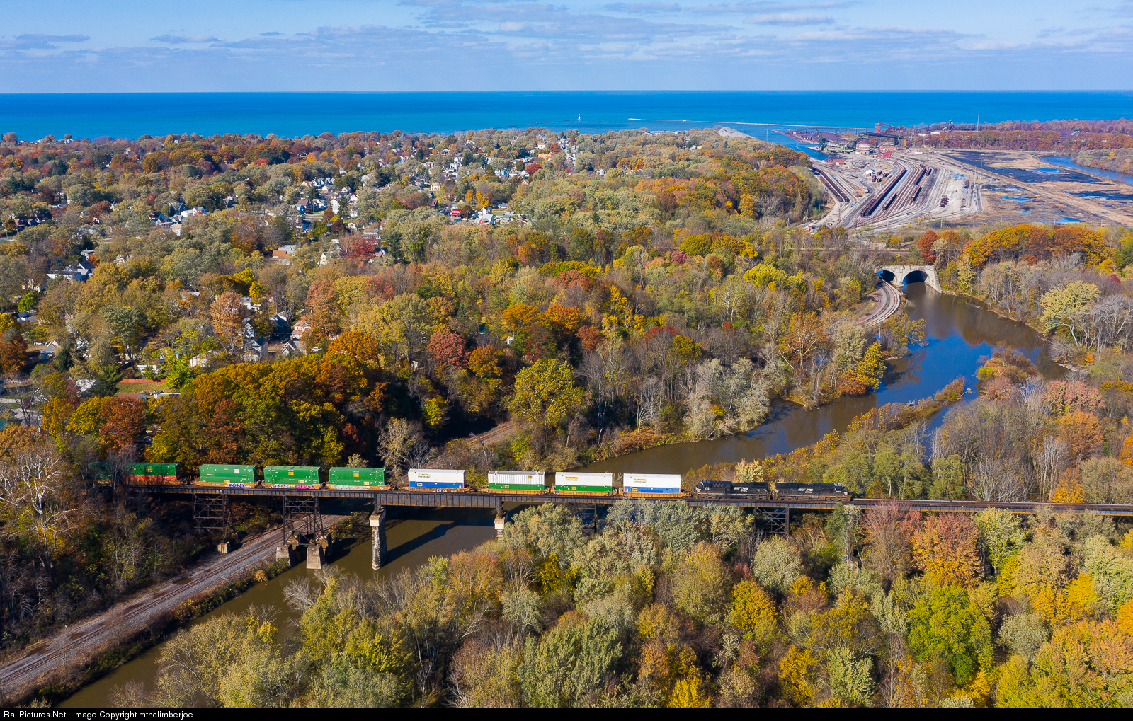| Norfolk Southern intermodal train 22K makes its way over the trestle in Conneaut, Ohio behind a pair of GE's on the last day of October 2020. Three railroads pass through Conneaut: Norfolk Southern seen here, CSX seen crossing over Conneaut Creek on a pair of trestles, and Canadian National (former Bessemer & Lake Erie) whose yard can be seen at Conneaut Harbor. |