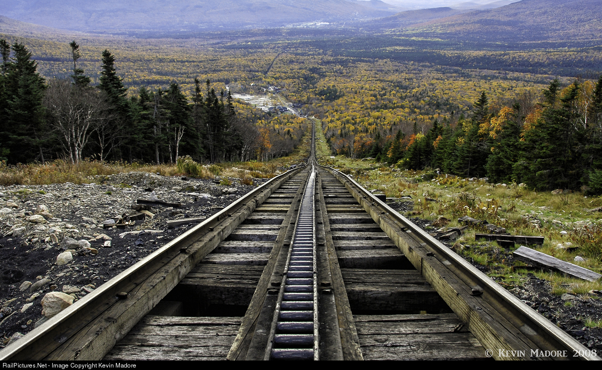 It's a long way down..... This image, made back in 2008, gives you the view that Mt. Washington Cog Railway passengers have as they descend Cold Spring Hill, just below the Waumbek Water Tank. Of course, the passengers typically see a locomotive sandwiched between them and this rather scary view....this is roughly a 30% grade. The steepest grade on the line is 37.4%, up the line, nearly a mile behind my camera position.