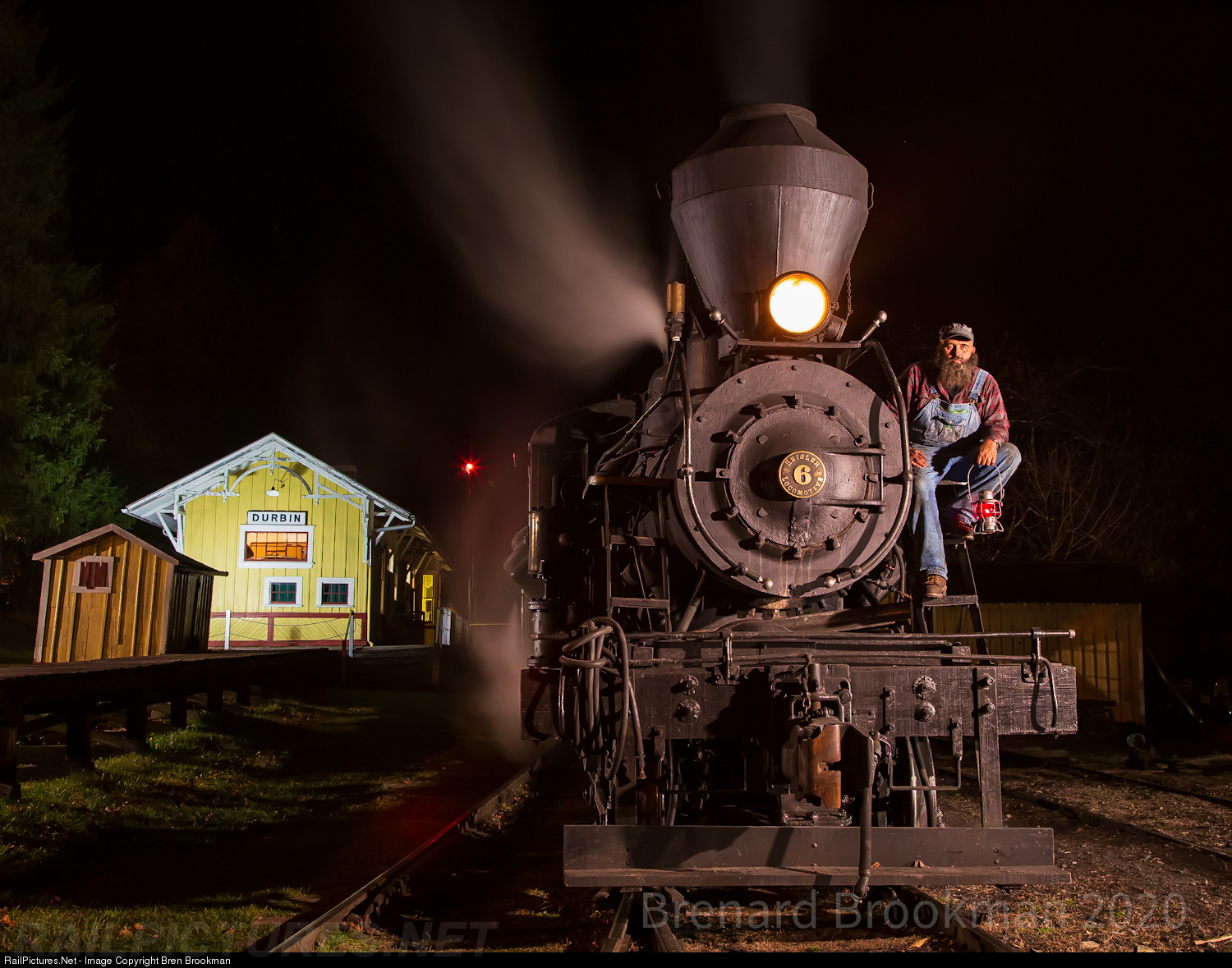 CSRR heisler number 6 sits at the Durbin Depot with engineer Ross up on the front of the locomotive with a lantern in hand after running to and from Holsterman earlier in the day.