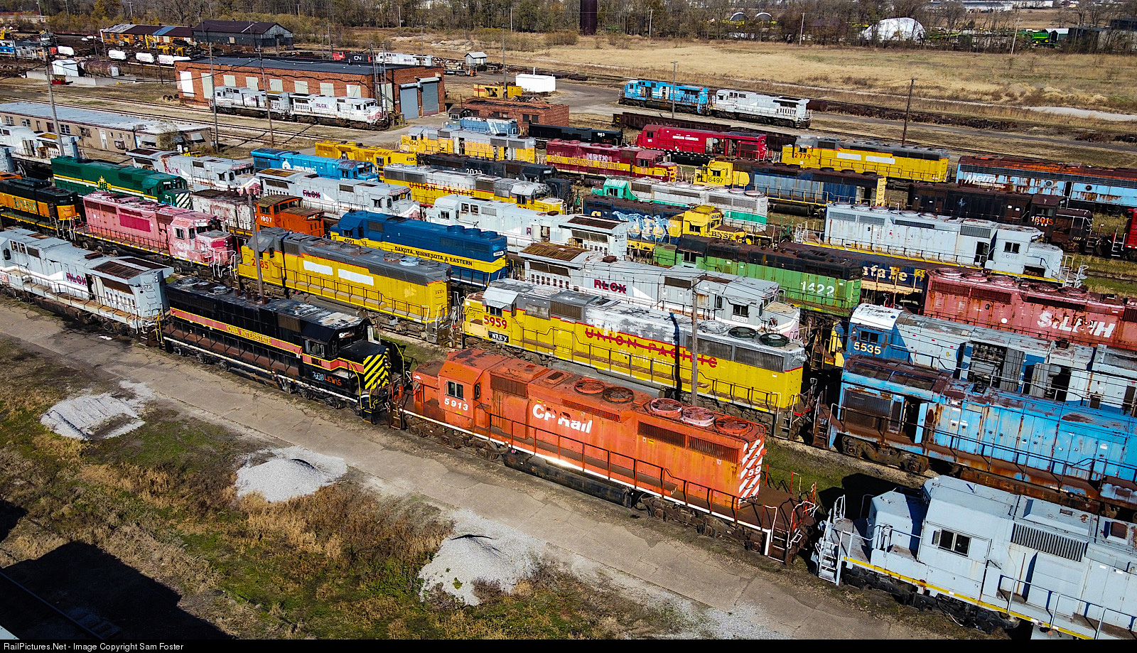 Dozens of old locomotives sit unused at the east end of National Railway Equipment’s Silvis facility.