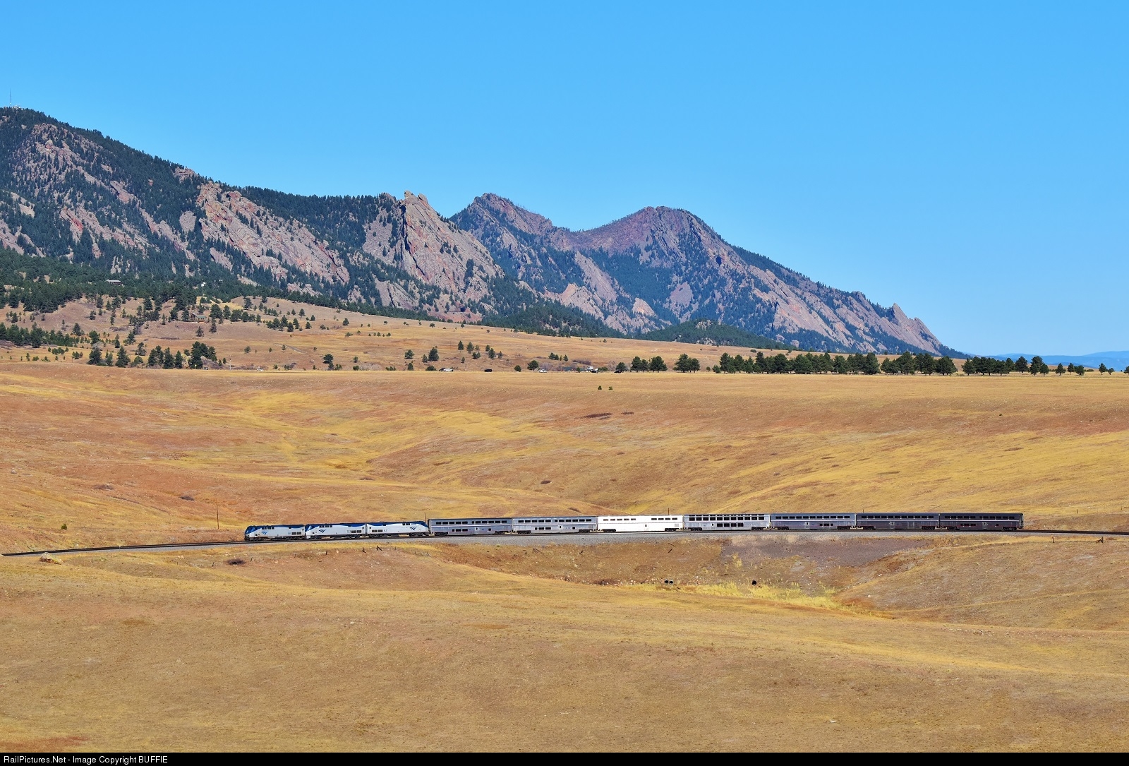| AMTK 69 (P42DC) leads a triple headed California Zephyr through Little Ten Curve as it climbs the grade towards the tunnel district on the Moffat Line. The Flatirons of Boulder, Colorado can be seen in the background. |