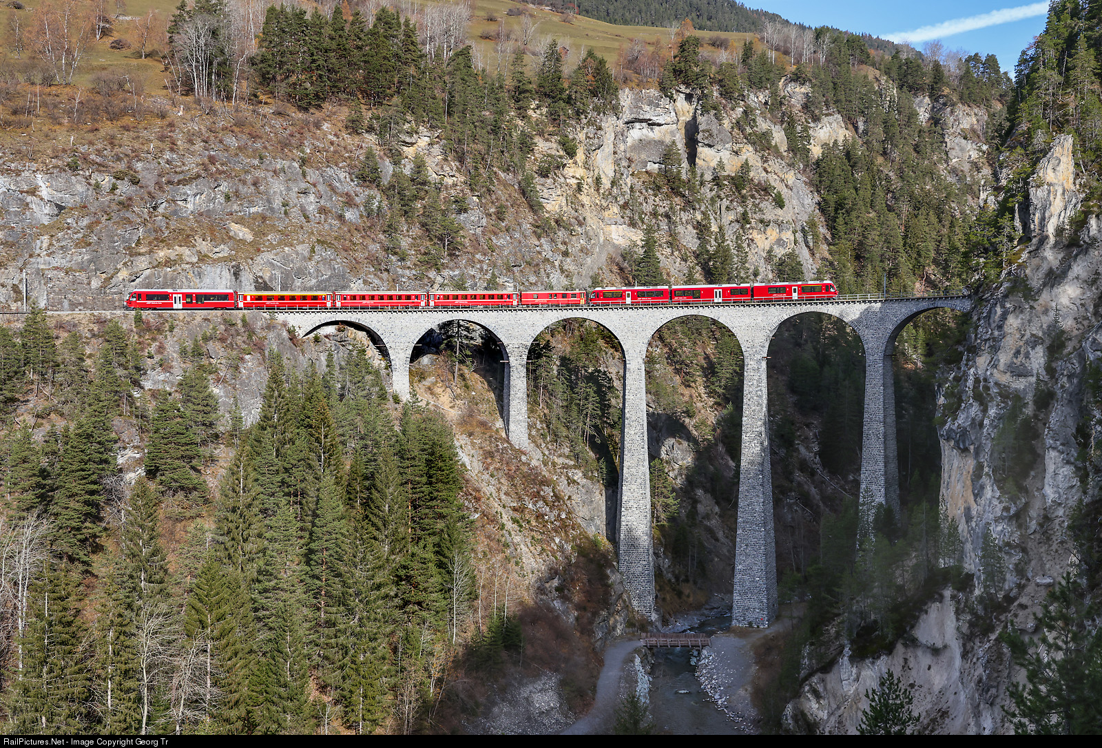 In the moment, two of the six ALVRA trainsets of the Rahetian Railway for the Albula line are not in service. 1 train has to undergo warranty works and 1 train was damaged in a derailment (rock on the track) near Sils im Domleschg on october, 26th. So the RhB is forced to run two replacement compositions, both with "Allegra" railcars and Bt cab cars. This is the Interregio 1136 from St.Moritz to Chur, crossing the 65 meter high Landwasser viaduct between Filisur and Alvaneu. The cars in the train are of type standard II, the "Allegra" ABe 8/12 # 3506 is in the rear shoving the train towards Chur.