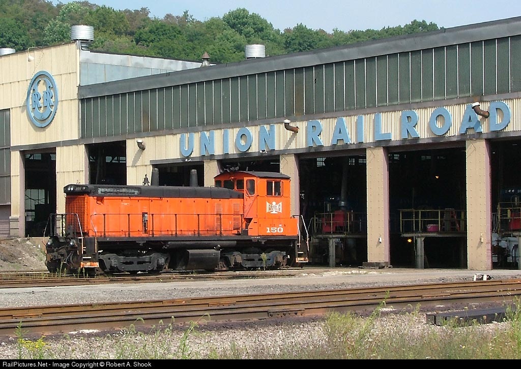 An ex-B&LE SW1500, now USX owned, sits outside the URR inspection shops while URR locos hide in the shadows.