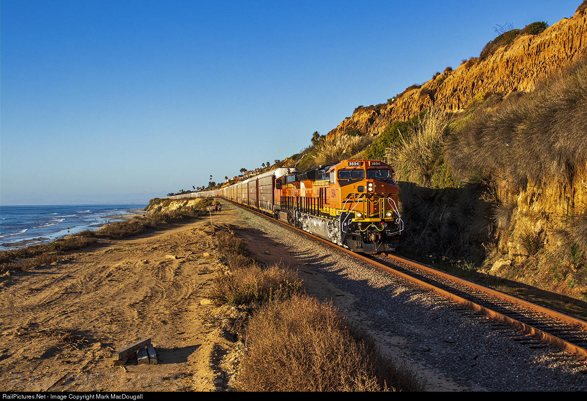 | A V-SBDSDG heads along the Del Mar Bluffs with a brand new Tier 4 GEVO leading in the late evening. A crew shortage led to a couple daylight freights on what are normally nocturnal moves along the scenic Surf Line. |