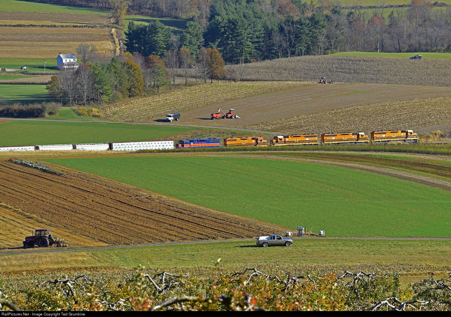 “Green Acres” After a delay caused by the need to double its westbound climb up the mountain, Maryland Midland’s UBHF (Union Bridge to Highfield turn) hustles its 71-car pickup from CSX east through the Frederick County farmlands surrounding Sabillasville.