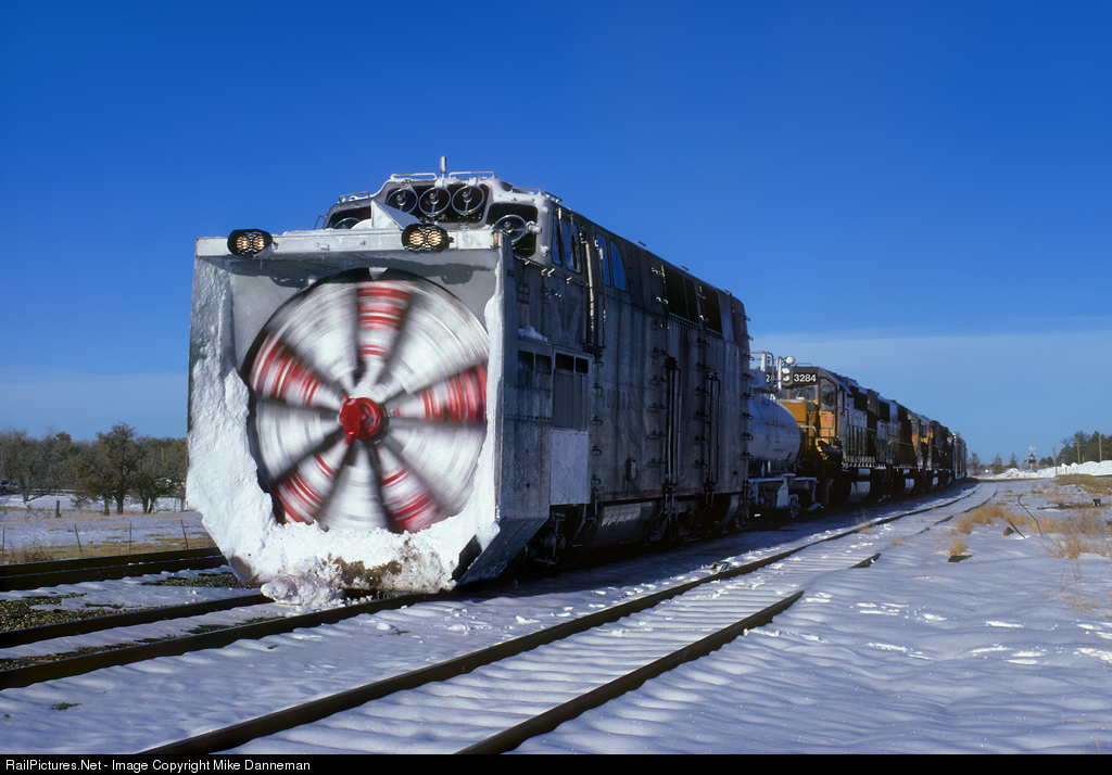 Union Pacific’s snow fighting outfit, led by rotary snowplow No. 900082, pauses at Limon, Colorado, before heading east on the Limon Subdivision, also known as the Kansas Pacific line on the morning of October 28, 1997. A large snowstorm hit Colorado before Halloween that year, dumping several feet on the state and nearby Kansas. This, coupled with high winds, filled the many cuts on the line making it impassable to the next crew change point of Sharon Springs.