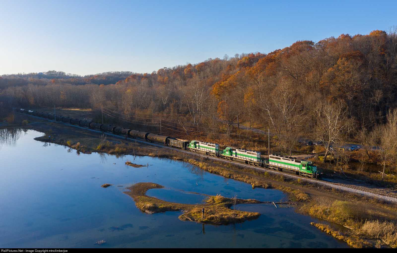 | The late day sun illuminates Wheeling & Lake Erie 612 as it heads down the Clartion Branch and along a shallow lake in Jefferson Hills, Pennsylvania. A trio of former FURX SD40-2's lead the train east. |