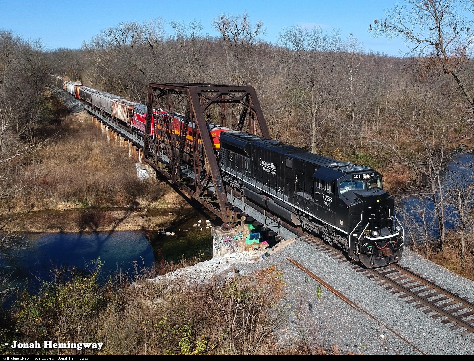An EMDX leaser takes a southbound Manifest over Spavinaw Creek.
