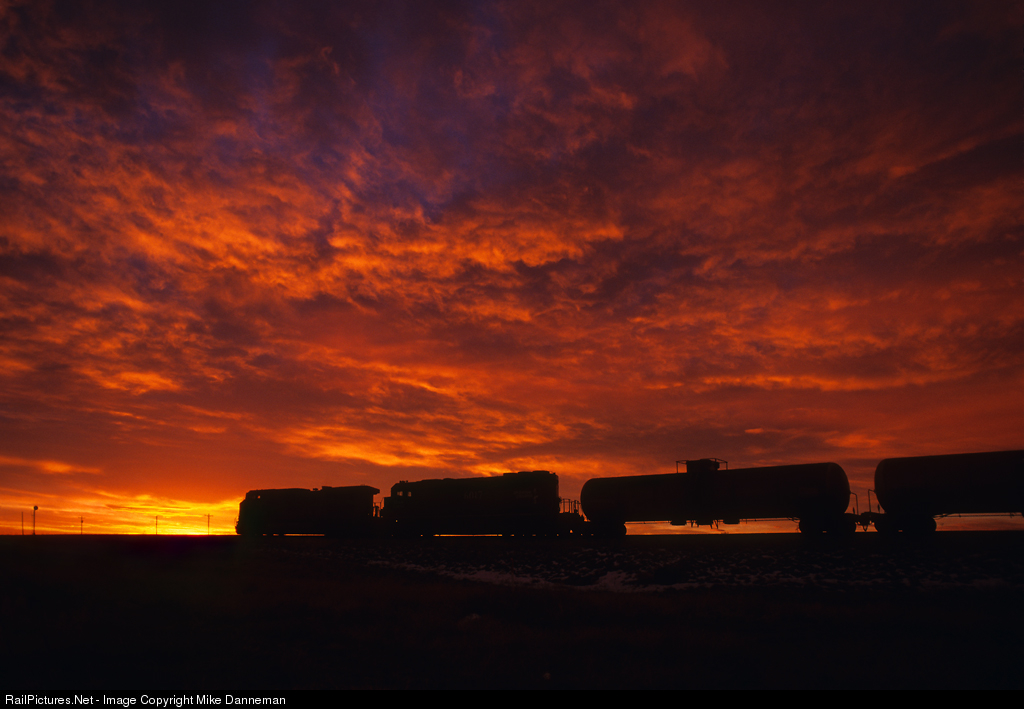 On January 24, 1998, an eastbound Burlington Northern Santa Fe freight is greeted by a fiery sunrise as it goes through Roggen, Colorado. This location is on BNSF’s Brush Subdivision operating from Denver to Sterling.
