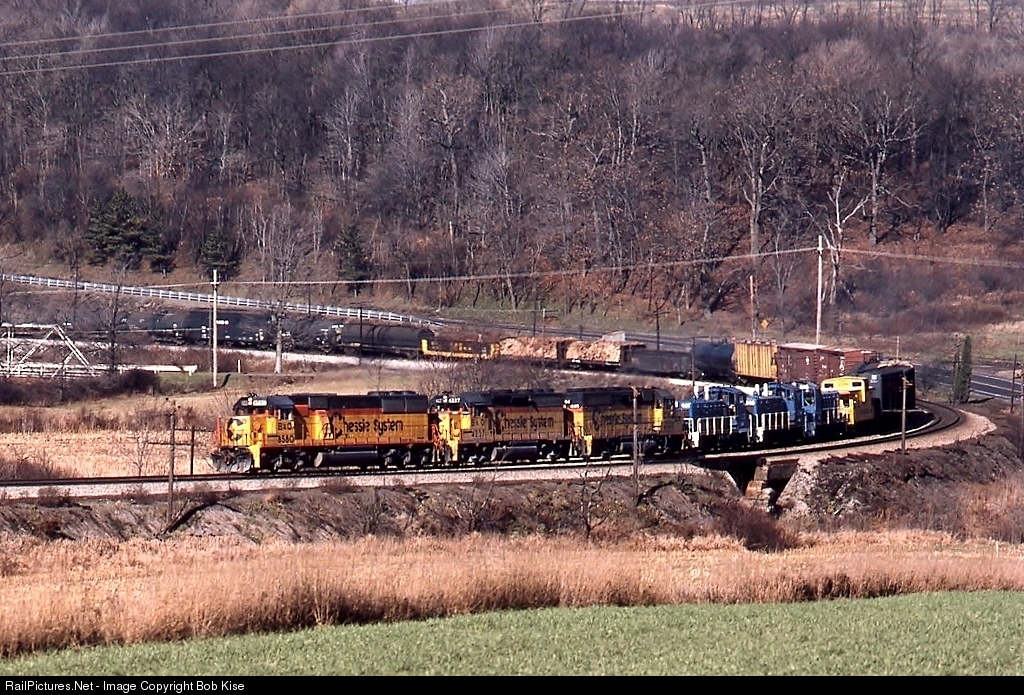 A 1984-built SD50 leads two Geeps and what appears to be three NWs or SWs in tow eastbound on the old B&O mainline near Salisbury Viaduct.