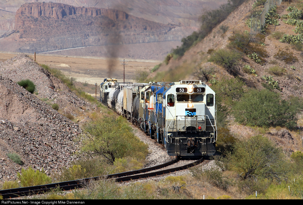 On October 22, 2020, a 16-car (14 loads and 2 empties) Freeport McMoRan freight powered by four EMD GP38/38-2s headed up the steep three to five percent grade on the railroad’s line from Clifton to Morenci, and stalled on one of the steeper sections, possibly due to one of the locomotives not loading properly. A second FMI train departing Clifton tied its train down at the derail/runaway track just above Clifton and went light engines to shove the stalled train, helping it the rest of the way up the hill to FMI’s yard at Morenci. In this view approaching that yard, nine EMD GP38/38-2 locomotives, fore and aft, growl upgrade into Morenci, Arizona. Nine locomotives for 16 cars!