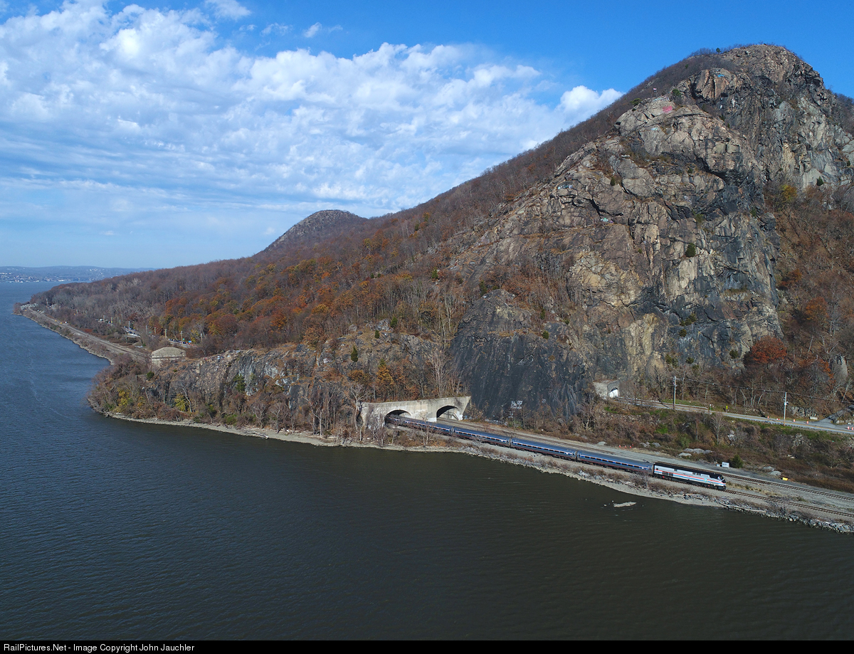 | A southbound Empire Service train clears the tunnels at Breakneck Ridge, with New York Penn about an hour ahead of it. |