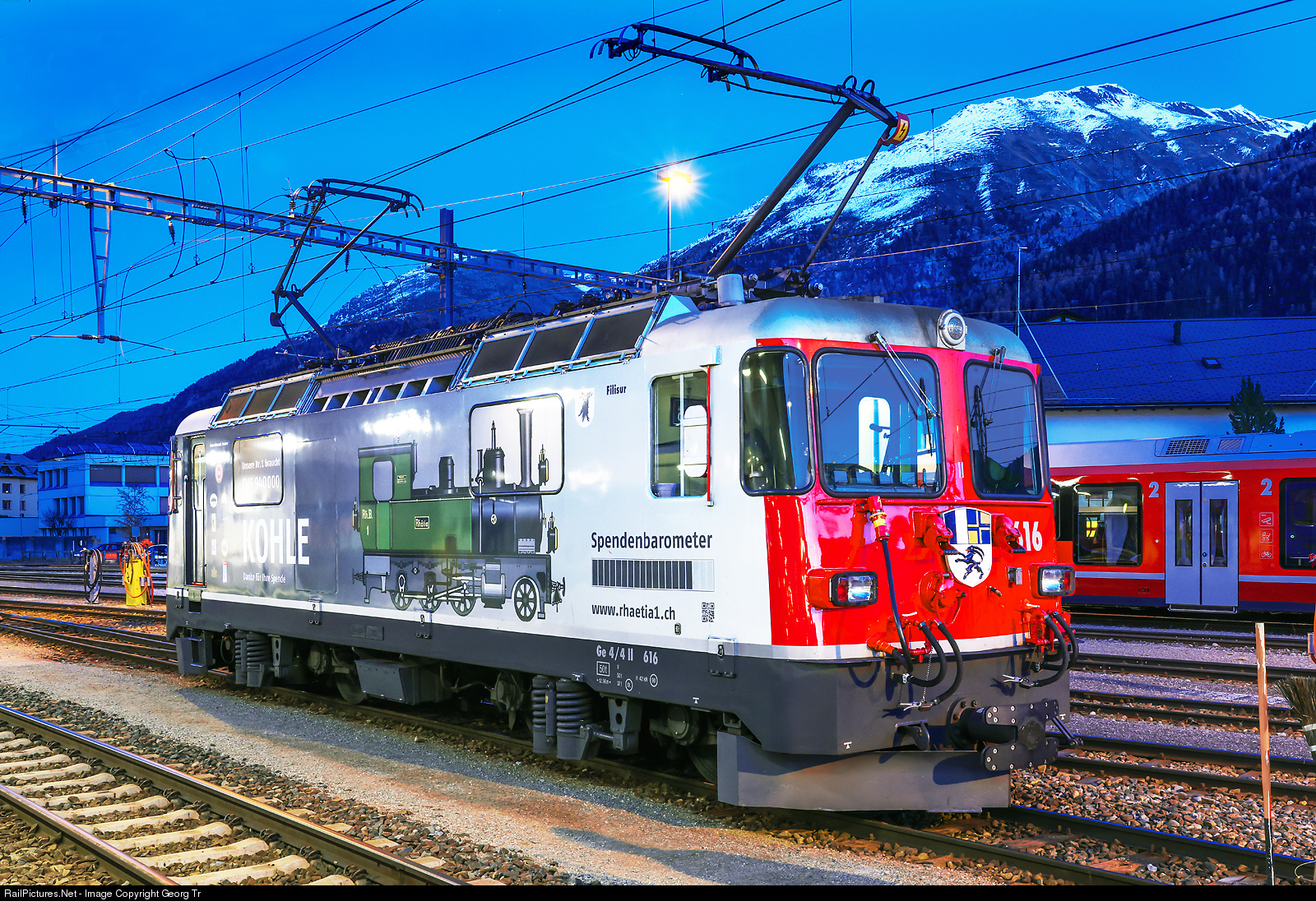 Locomotive Ge 4/4 II # 616 "Filisur" of the RhB returned from St.Moritz to Samedan in the blue hour and is changing driving direction to go into the depot. In this moment, both pantographs are lifted. The locomotive has a publicity paint scheme (adhesives) for collection of donations for the refurbishment of the steamlocomotive G 3/4 # 1 "RHAETIA" from 1889, the very first locomotive of the RhB respectively the predessor railway Landquart-Davos (LD). Most of the needed amuount of about 940 000 swiss francs were collected already.