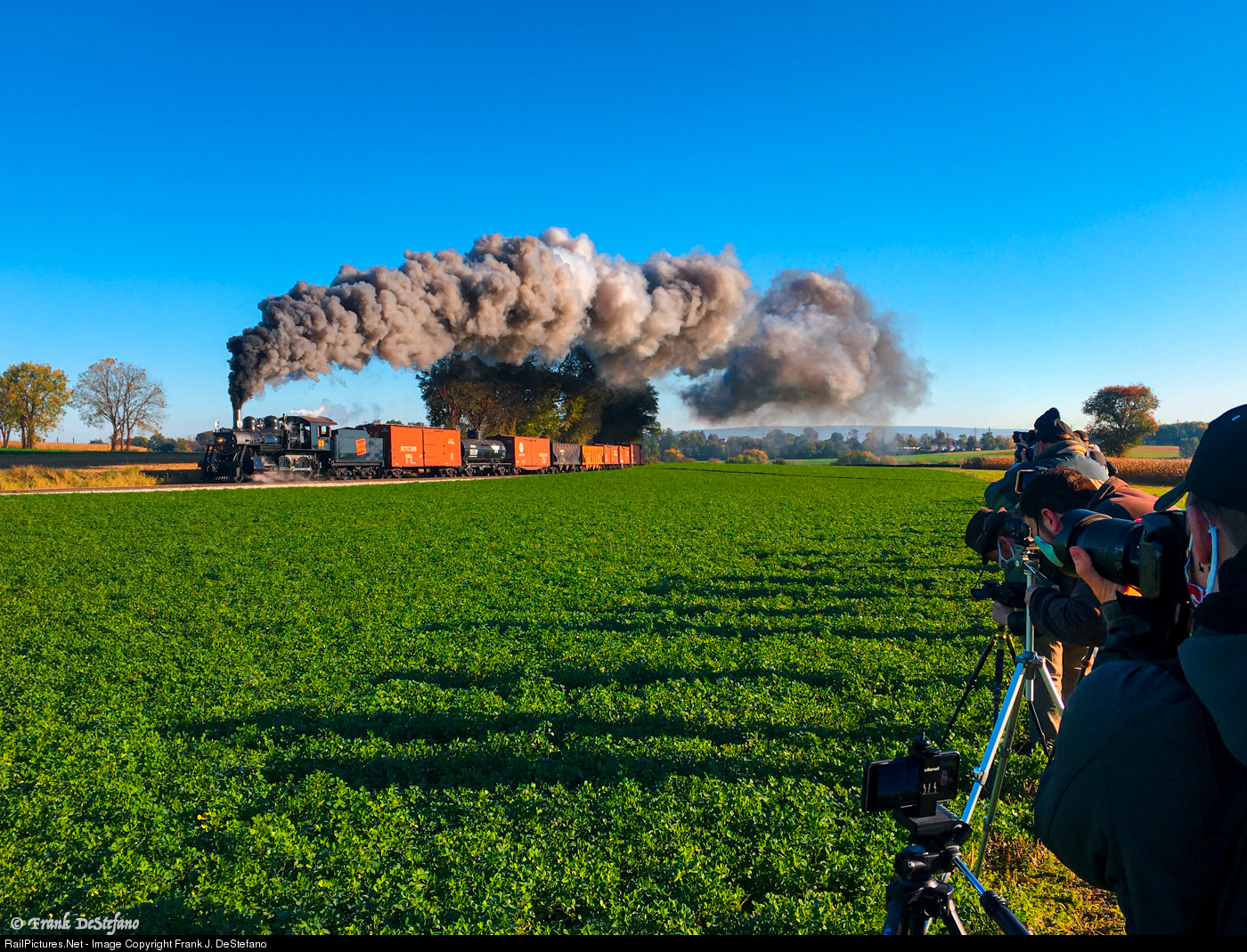 | Ex-Canadian National #89 pulls a fleet of vintage freight cars on the Strasburg Rail Road, while a line of photographers and videographers take their shot.