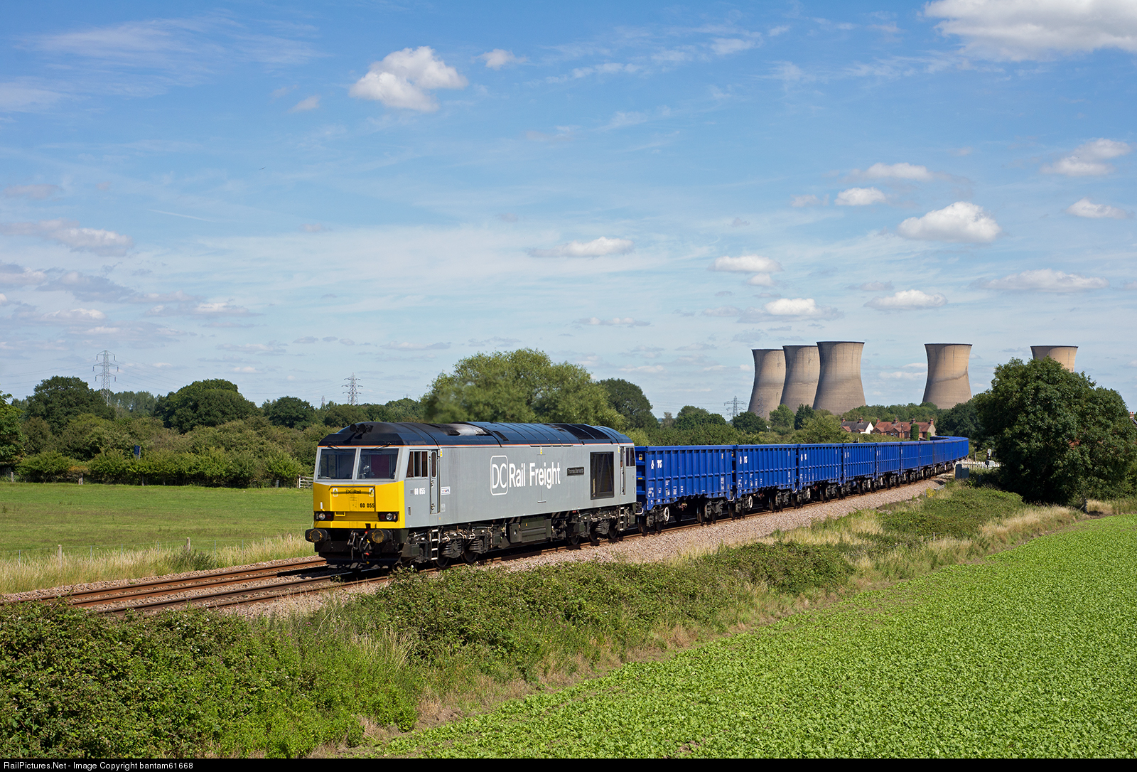 | With the cooling towers of the closed power station behind, 60055 passes Willington with 6Z50 14:53 Chaddesden Sidings to Carlisle Kingmoor |