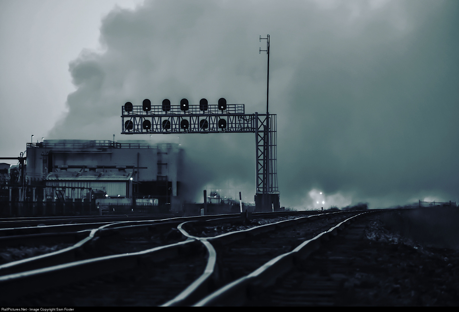 NS 1085 passes through a thick cloud of steam let off from one of the many industries along Norfolk Southern’s Chicago Line in Whiting.