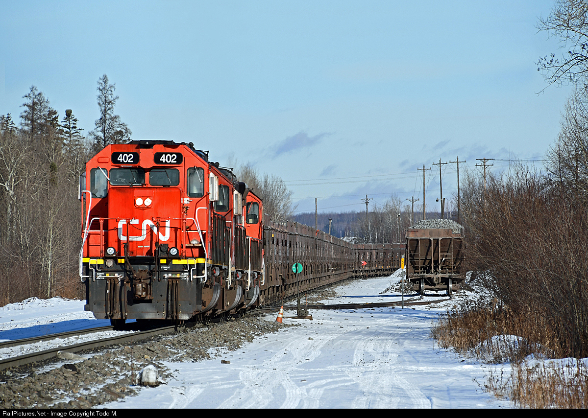 | Another one of CN's original heritage units, DMIR 402 along with DMIR 404 and DMIR 408 shove back under the coarse crusher at United Taconite to load. |