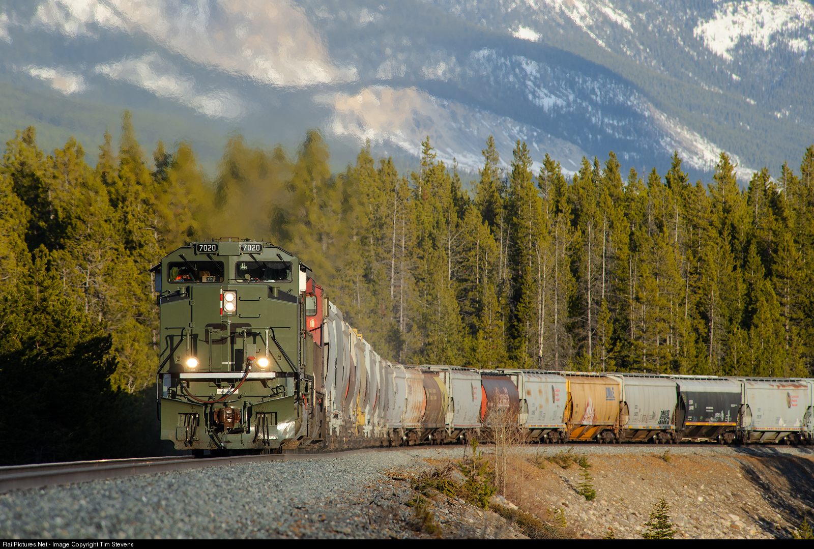NATO green SD70ACU 7020 climbs the hill out of Lake Louise with a loaded grain train.