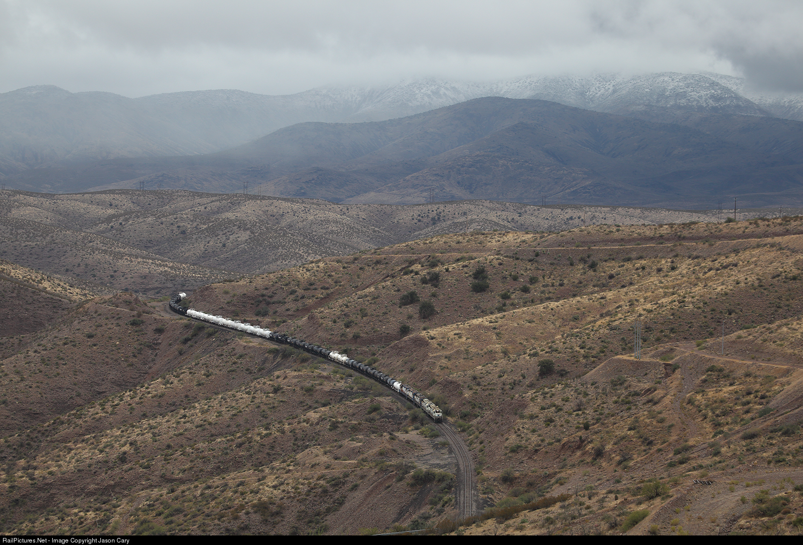 A Freeport McMoran Hill Turn slides down the steep grade between Corral Cut and Clifton. The grade here varies between 3.5-4.2%, when compensated for curvature the grade is a equivalent to almost 5%!!!! .... A unusual snow storm has left a white blanket on the higher mountains surrounding the Clifton-Morrenci area. The train is bound for the Arizona Eastern yard at Clifton.
