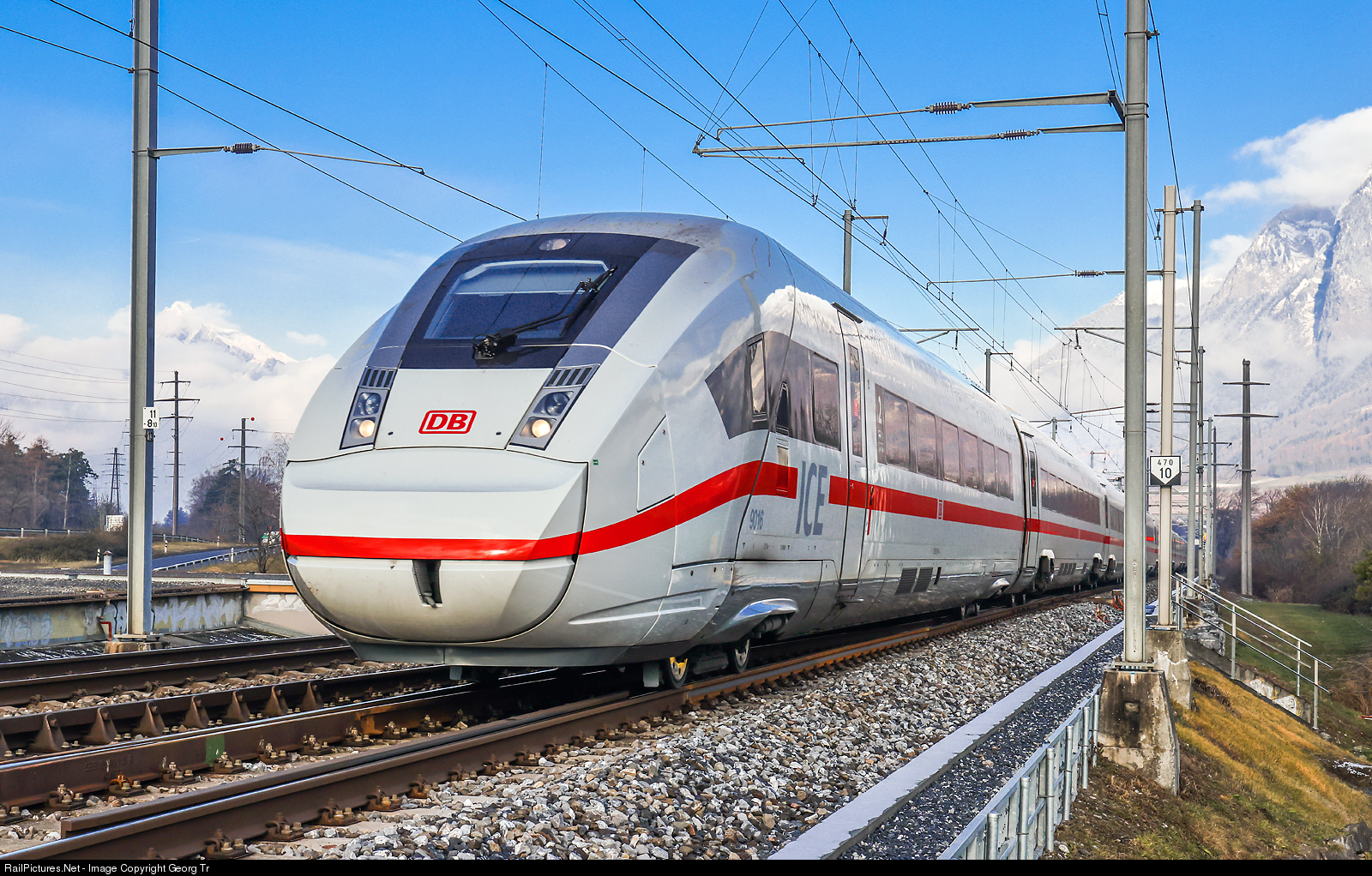 | ICE 4 # 9016 of the Deutsche Bahn is running the ICE 271 from Frankfurt via Mannheim-Basel-Zürich to Chur, entering Landquart. |