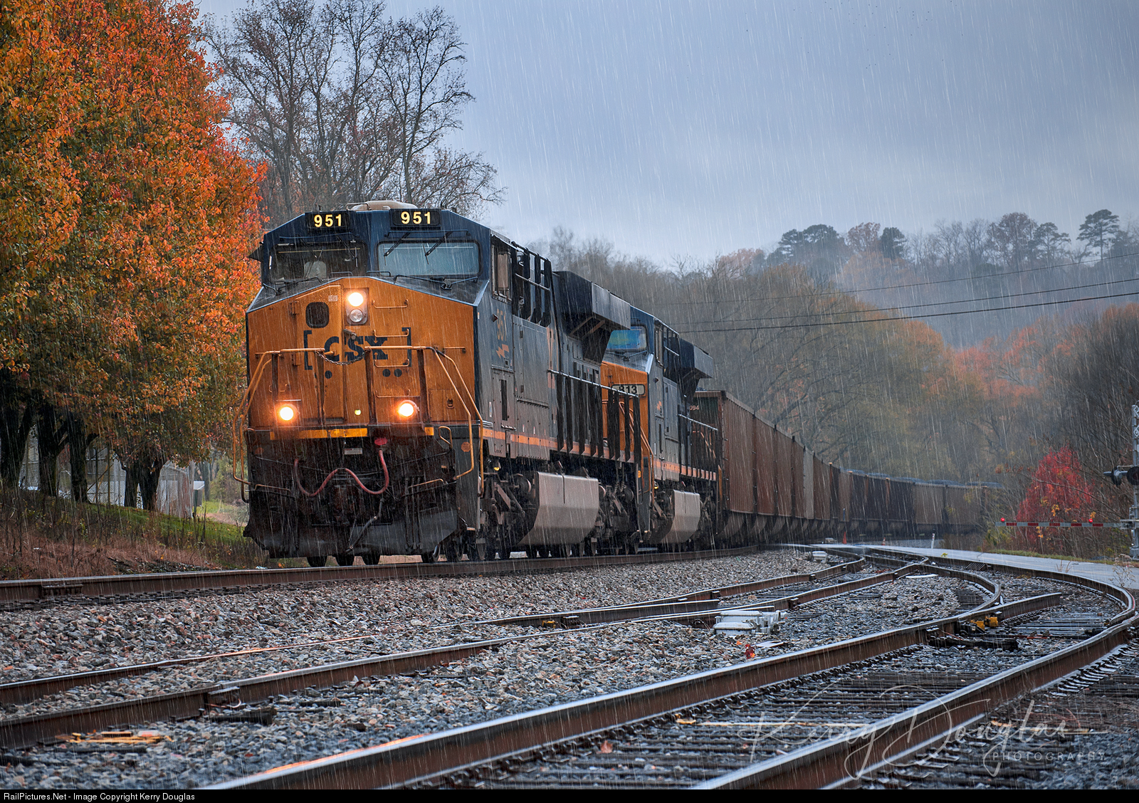 In the driving rain the Seminole Electric's Coal Bucket CSX N015-26 (Evansville,IN-Bostwick,FL) glides through the s-curve south pass the Tyner Holdout signal (MP WA-128.7) on the CSX Western & Atlantic Sub. N015 is heading to the Palatka Steam Plant just north of the town of Palatka, FL off the St. Johns River. With a major short hand of crew out of the Boyles Terminal CSX has temporary profiled a couple of freight and, unit trains over to the more Mountainous alternate side of the Southeastern Corridor for Manchester, GA via of Nashville, Chattanooga, and Atlanta.