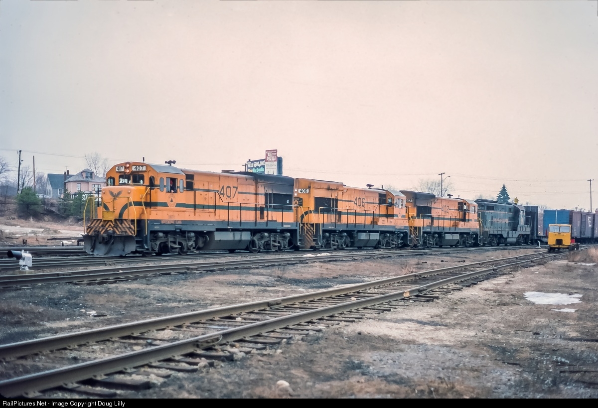 Three of Maine Central’s Independence Class “baby boats” and a GP7 lead a train into Rigby Yard in Portland, Mane. The ten U18’s were named for revolutionary war patriots and concepts, and were as close as the MEC came to having any bicentennial units.